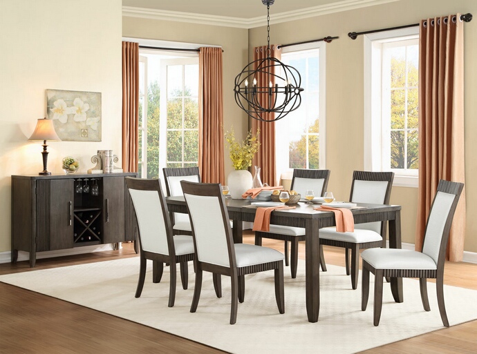7 pc Piqua collection grey finish wood dining table set with upholstered seats. This set includes the table, 6 – side chairs with padded seats. Table measures 42″ x 60″ (78″ with leaf) x 30″ H. Side chairs measure 21″ x 25″ x 40″ H. Additional chairs also available separately. Some assembly required.