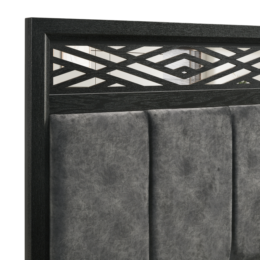 00-1655-4PC 4 pc Obsidian black finish wood mottled grey fabric padded queen bed set mirrored accents. Features a low sheen black finish, channel padded headboard with mirrored accents. This set includes the bed, nightstand, Dresser and Mirror. Bed Measures 63.4″ x 85″ x 56″ H. Nightstand measures 16″ x 24″ x 25″ H. Dresser measures 58″ x 16.5″ x 37″ H. Mirror measures 39″ x 2″ x 40″. Chest also available separately. Also available in Cal King and Eastern king. Some assembly required.