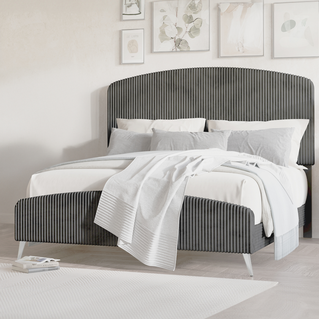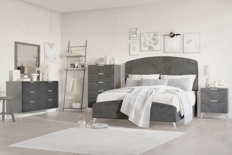 00-4378G-4PC 4 pc Kailani grey finish wood grey fabric upholstered headboard queen bed set silver accents. Features grey fabric headboard with silver tone legs and hardware. This set includes the bed, nightstand, Dresser and Mirror. Bed Measures 64.4″ x 86.4″ x 56.1″ H. Nightstand measures 15.6″ x 21.7″ x 25.6″ H. Dresser measures 58.4″ x 15.6″ x 34.8″ H. Mirror measures 39.5″ x 1″ x 29.5″. Chest also available separately. Also available in Cal King and Eastern king. Some assembly required.