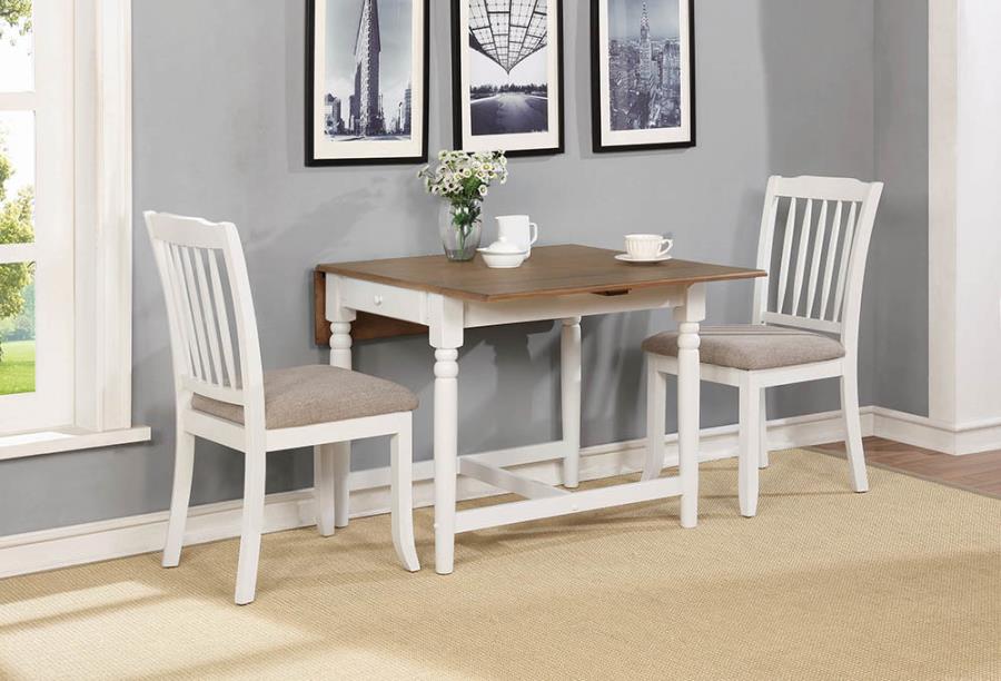 3 pc Hesperia pale ale white finish wood breakfast bistro drop leaf table set. This set includes the table with 2 – drop leaves with 2 – side chairs light brown fabric seats . Table measures 44″ x 36″ x 30″ H. Chairs measure 17.75″ x 21.25″ x 38.25″ H. Additional chairs also available separately. Some assembly required.