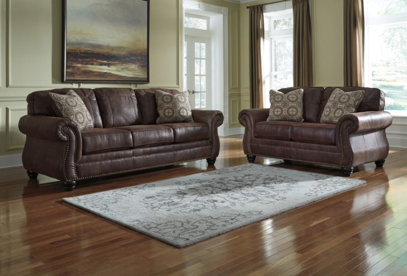 2 pc Breville collection espresso faux leatherc upholstered sofa and love seat set with rounded arms. This set includes the Sofa and Love seat featuring rounded arms. Sofa measures 90″ x 39″ x 39″ H. Love seat measures 67″ x 39″ x 39″ H. Optional chair and ottoman also available separately. Some assembly may be required.