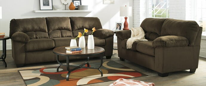 2 pc Dailey collection chocolate colored fabric upholstered sofa and love seat set with overstuffed arms. This set includes the sofa and the love seat. Sofa measures 89″ x 37″ x 39″ H. Love seat measures 67″ x 37″ x 39″ H. Some assembly required.