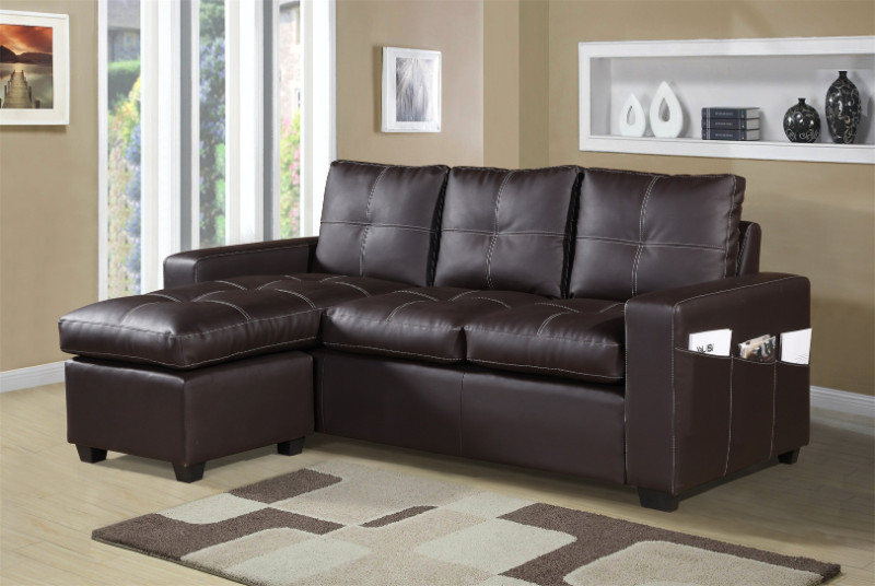 2 pc Everly collection brown faux leather upholstered sectional sofa set with reversible ottoman chaise. Sectional features a reversible ottoman chaise. Sectional measures 82″ x 57″ L Chaise x 34″ D x 34″ H. Some assembly may be required.