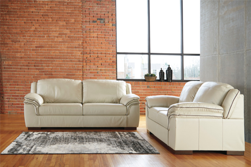 2 pc Islebrook collection vanilla leather match upholstered sofa and love seat set with overstuffed arms. This set includes the Sofa and Love seat featuring rounded arms. Sofa measures 91″ x 40″ x 39″ H. Love seat measures 70″ x 40″ x 39″ H. Optional chair and ottoman also available separately. Some assembly may be required.