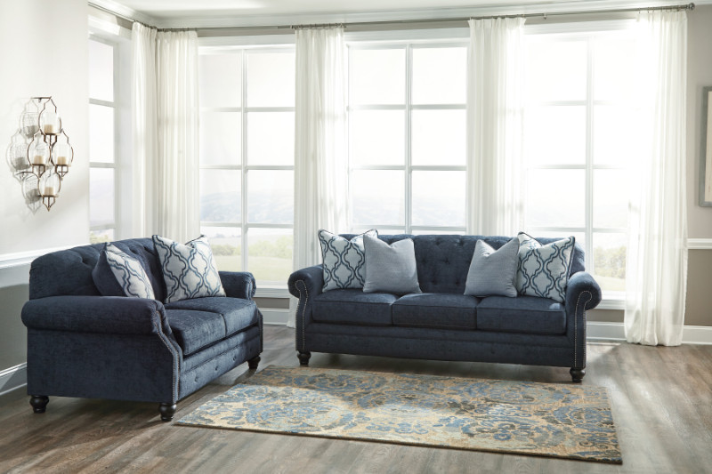 2 pc LaVernia collection navy fabric upholstered sofa and love seat set with rounded arms. This set includes the Sofa and Love seat featuring rounded arms. Sofa measures 91″ x 39″ x 39″ H. Love seat measures 69″ x 39″ x 39″ H. Optional chair and ottoman also available separately. Some assembly may be required.