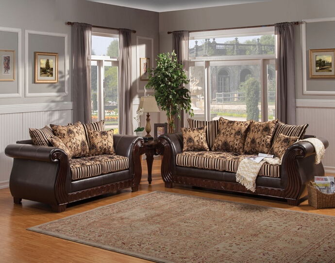 2 pc Rutherford traditional style 2 tone black colored Sofa and Love seat set with fabric cushions and leather like vinyl arms and back. Sofa measures 95″ x 36″ x 38″ , Love seat measures 73″ x 36″ x 38″ . Some assembly required.
