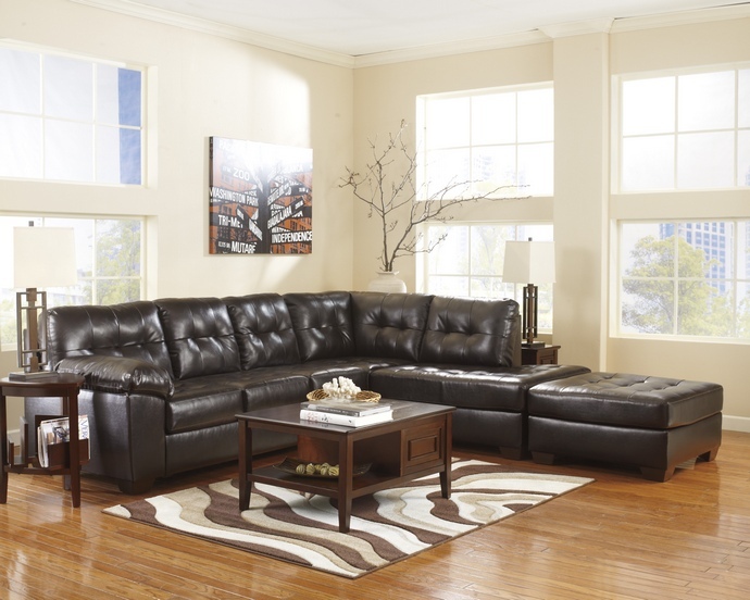 2 pc Alliston collection chocolate bonded leather upholstered sectional sofa with chaise. This set includes the sofa and the chaise featuring overstuffed arms. Sectional measures 120″ X 85″ L chaise x 39″ D X 38″ H. Also available with chaise on opposite side. Ottoman and recliner also available separately. Some assembly may be required.