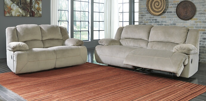 Ashley Furniture 56703-81-86 2 pc toletta collection granite colored fabric upholstered sofa and love seat set with recliners on the ends
