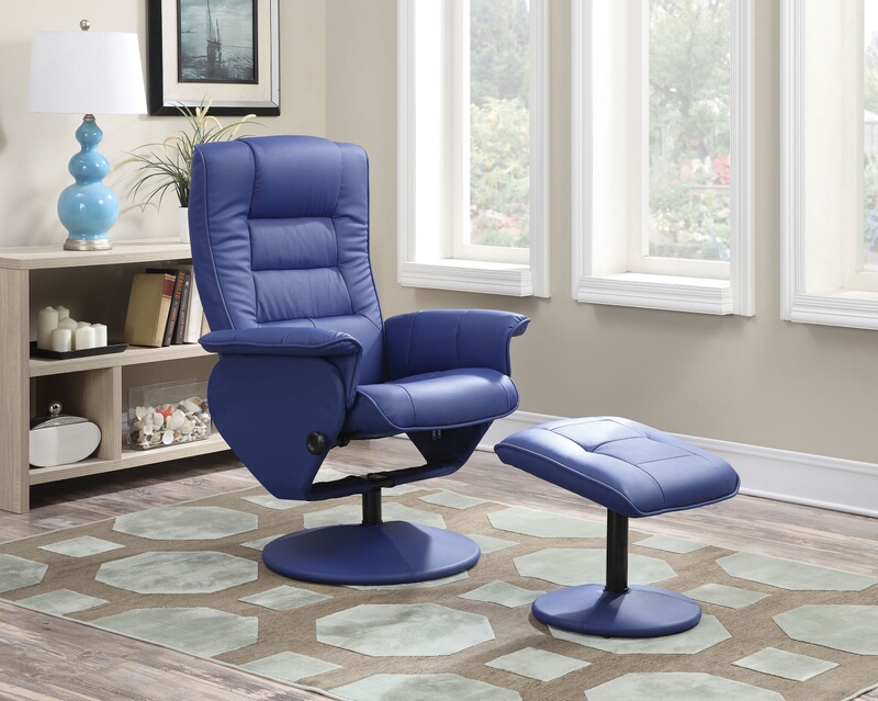 Arche blue vinyl swivel reclining chair and ottoman. Chair measures 30″ x 31″ x 42″ H. Ottoman measures 19″ x 18″ x 17″ H. Some assembly may be required.