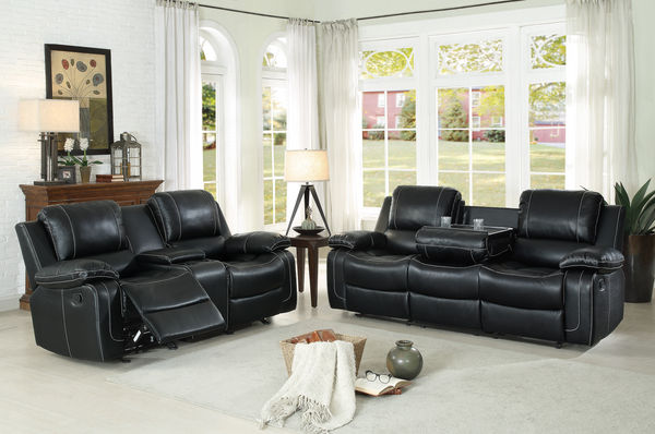2 pc Oriole black leather airehyde match double reclining sofa and love seat set. This set features a sofa with drop down center table with a recliner on each end and a love seat with center console and recliners on the ends. Sofa measures 88″ x 39″ x 39″ H. Glider reclining Love seat measures 78″ x 39″ x 39″ H. Optional single recliner also available separately and measures 42″ x 39″ x 39″ H. Some assembly required.