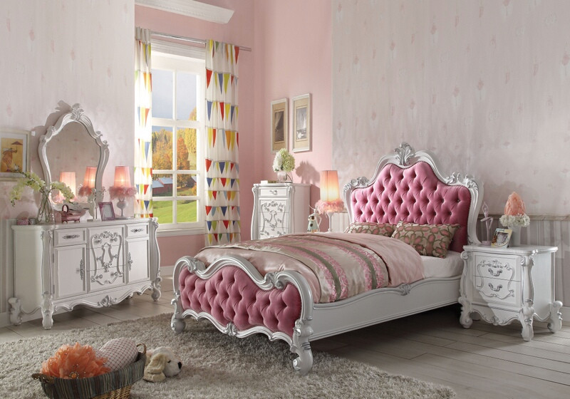 5 pc Versailles antique white finish wood pink tufted queen bedroom set. This set includes the Queen bed set, one nightstand, Dresser, Mirror and Chest. Queen bed features decorative carvings, tufted headboard and footboard. Queen bed measures 90″ x 67″ x 69″ H. Nightstand measures 26″ x 19″ x 26″ H. Dresser measures 58″ x 19″ x 34″ H. Mirror measures 34″ x 41″ H. Chest measures 30″ x 19″ x 48″ H. Some assembly may be required. Full also available at additional cost.