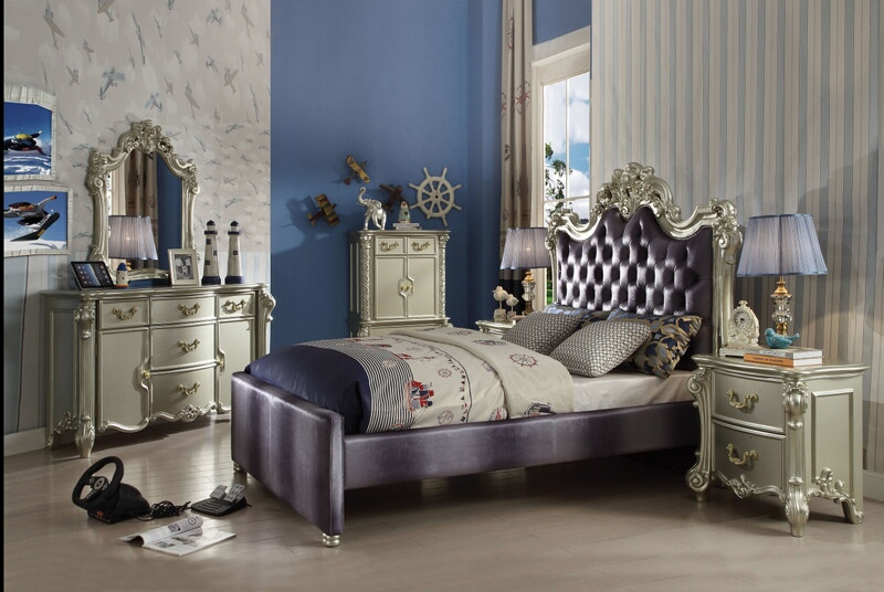 5 pc vendome ii champagne finish wood gray tufted queen bedroom set. This set includes the Queen bed set, one nightstand, Dresser, Mirror and Chest. Queen bed features decorative carvings, tufted headboard and footboard. Queen bed measures 88″ x 68″ x 68″ H. Nightstand measures 27″ x 18″ x 26″ H. Dresser measures 62″ x 18″ x 36″ H. Mirror measures 34″ x 41″ H. , Chest measures 39″ x 17″ x 52″ H. Some assembly may be required. Full also available at additional cost.