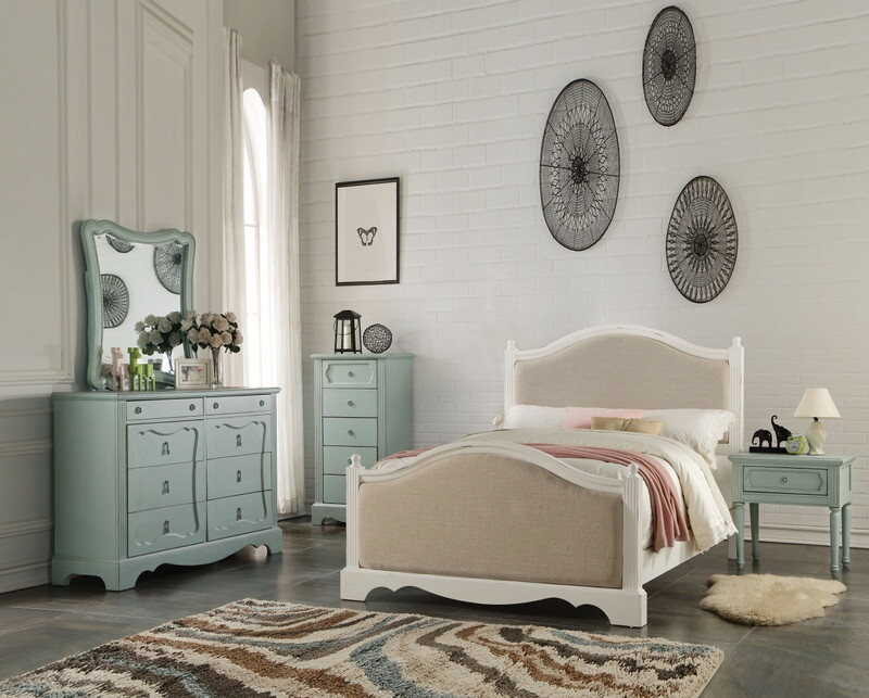 4 pc Morre antique white finish wood beige linen full bedroom set. This set includes the Full bed set, one nightstand, Dresser, and Mirror. Full bed measures 84″ x 60″ x 61″ H. Nightstand measures 24″ x 17″ x 25″ H. Dresser measures 56″ x 18″ x 40″ H. Mirror measures 36″ x 37″ x 2″ H. Some assembly may be required. Twin also available at additional cost.