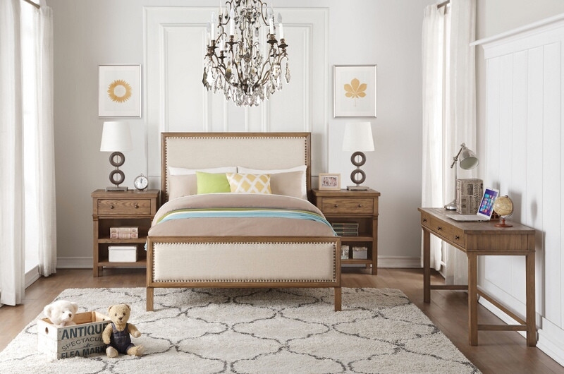 4 pc Inverness reclaimed oak finish wood beige linen full bedroom set. This set includes the Full bed set, one nightstand, Dresser, and Chest. Full bed measures 80″ x 57″ x 53″ H. Nightstand measures 24″ x 17″ x 30″ H. Dresser measures 58″ x 18″ x 44″ H. Chest measures 38″ x 18″ x 52″ H. Some assembly may be required. Twin also available at additional cost.