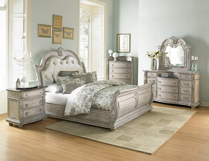 Source: Home Elegance 1394N-5PC 5 pc palace ii collection rich weathered white light rub thru finish wood sleigh bedroom set