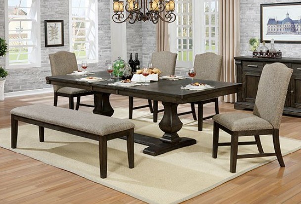 6 pc Faulk espresso finish wood trestle base dining table set. This set includes a table , bench and 4 – side chairs. Table measures 40″ x 76″ (94″ with 1 – 18″ leaf) x 30″ H. Chairs measures 20″ x 26 1/2″ x 41 1/4″ H. Bench measures 63″ x 16″ x 19 1/2″ H. Some assembly may be required.