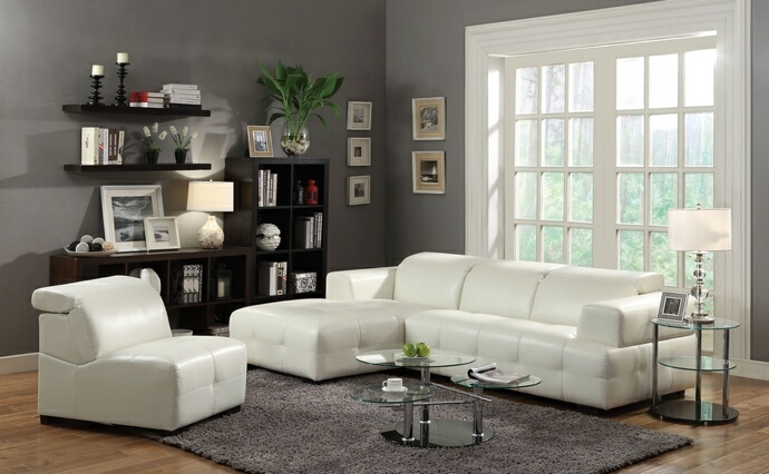 2 pc Darby collection modern style white bonded leather upholstered sectional sofa with adjustable headrests. This set includes the Left arm chaise and right side loveseat, additional armless chairs available separately. Sectional measures 107″ x 38.5″ x 29″ H x 67″ L Chaise. Some assembly required.