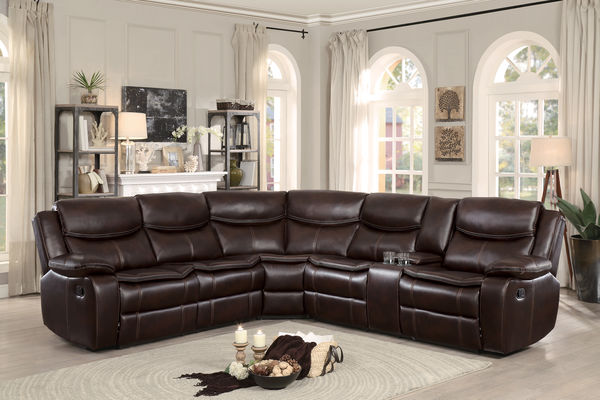 8230BRW-3pc 3 pc Bastrop collection brown leather gel match upholstered sectional sofa with recliners and console table