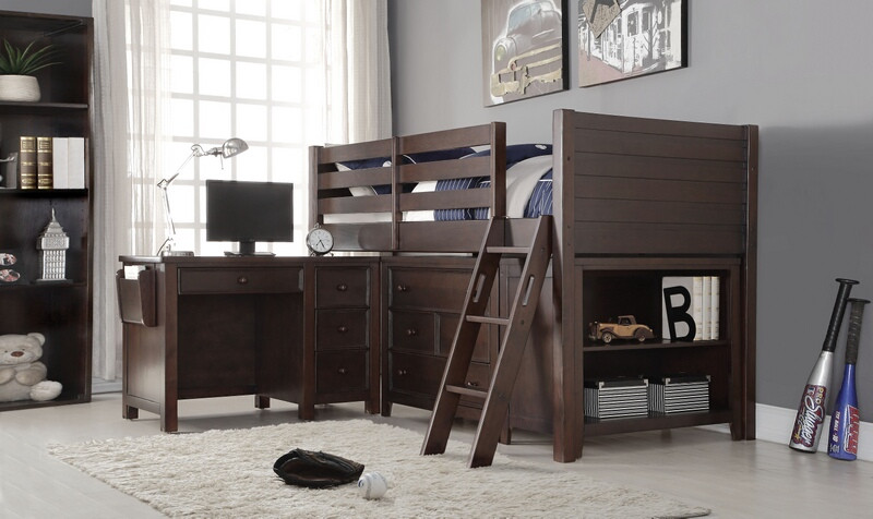 Lacey espresso finish wood twin size loft bed with desk and shelves. This set features a panel look on the ends of the bed, with a pull out desk workstation area and slide out storage. Measures 81″ x 43″ x 53″ H. Desk measures 43″ x 22″ x 30″ H. Chest measures 37″ x 18″ x 30″ H. Bookcase measures 37″ x 18″ x 30″ H. Some assembly required.