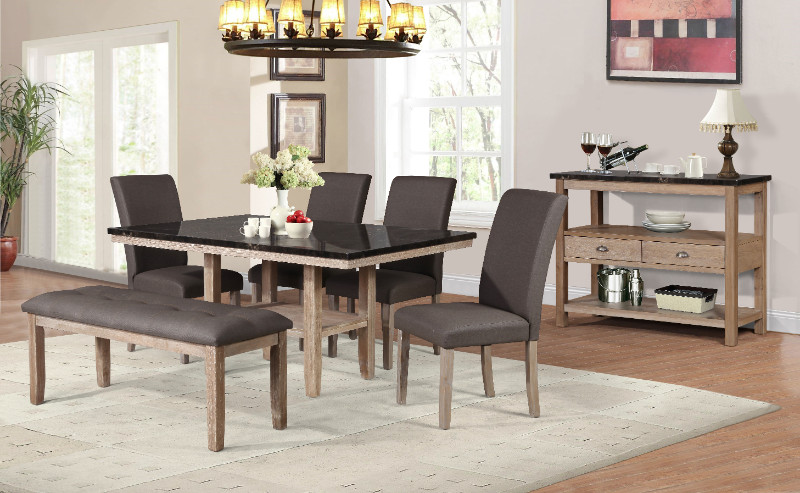 6 pc Atlantic collection light brown finish wood dining table set. This set includes the table with faux marble top, 4 side chairs and bench with metallic faux leather upholstery. Table measures 60″ x 42″ x 30″ H. Side chairs measure approx. 18″ x 18″ x 40″ H. Bench measures approx. 48″ 17″ x 19″ H. Some assembly required.