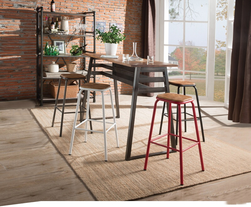 5 pc Scarus natural finish wood to gunmetal frame bar table set. This set includes the table and 4 – chairs with natural wood finish tops. Table measures 24″ x 59″ x 42″ H. Chairs measure 16″ x 16″ x 30″ H. Chairs come in four colors White, Black, Red and Gunmetal. Some assembly required.