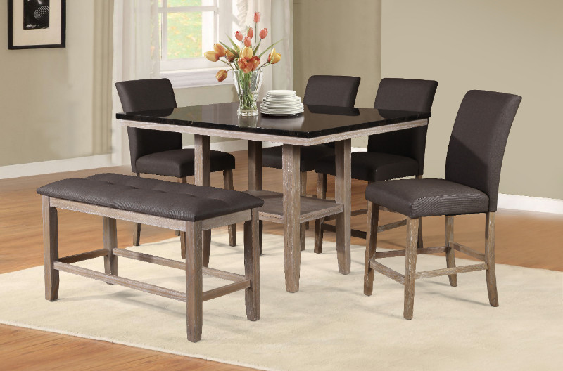 6 pc Atlantic light brown finish wood counter height dining table set. This set includes the table with faux marble top, 4 side chairs and bench with metallic faux leather upholstery. Table measures 54″ x 42″ x 36″ H. Side chairs measure approx. 18″ x 18″ x 41″ H. Bench measures approx. 48″ 17″ x 25″ H. Some assembly required.