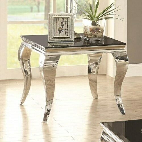 Wildon chrome finish and beveled black glass top end table. Measures 24″ x 24″ x 23″ H. Some assembly required.