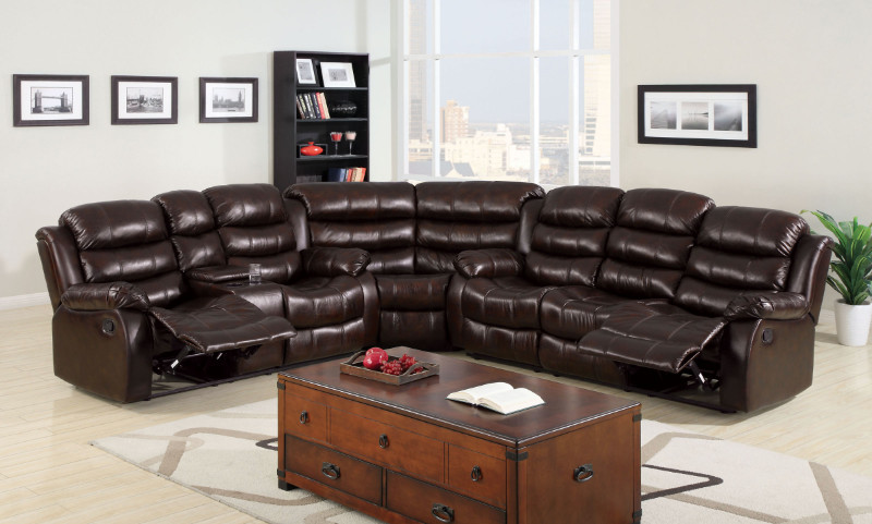 3 pc berkshire dark brown leather-like fabric sectional sofa set. The Berkshire Reclining Sofa sectional has large plush cushions and padded armrest to help relax you after a long day. Sectional measures 120″ x 110″ x 41″ x 40 1/2″ H. Some Assembly May Be Required.