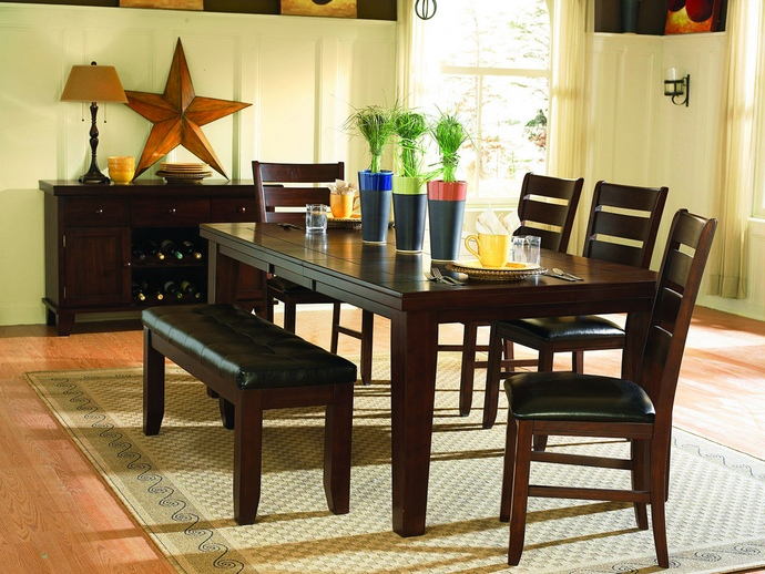 6 pc ameillia dark oak finish wood dining table set vinyl padded seats. This set includes the table with one butterfly leaf with 4 – side chairs and one bench with vinyl padded seats. Table measures 42″ x 64″ (82″ with 1- 18″ leaf) x 30″ H. Side chairs measure 20″ x 23″ x 40″ H. Bench measures 60″ x 16″ x 20″ H. Additional chairs and Buffet also available separately. Some assembly required.