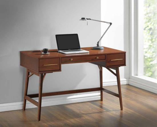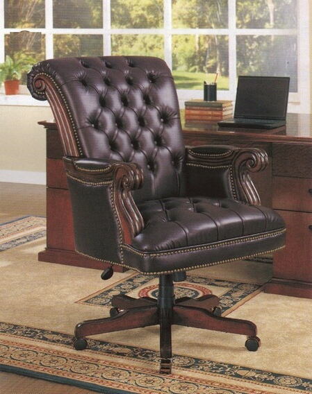 Leather high back tufted seat and back executive office chair with pin trim and wood accents, features a gas lift with swivel and tilt capabilities with casters. Comes only in a burgundy colored leather. Measures 29 1/2″ x 37 1/2″ D x 42 1/2″ – 45 1/2″ H. Some assembly required.