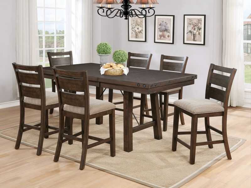 Source: 5 pc James brennan medium brown finish wood and metal frame counter height dining table set