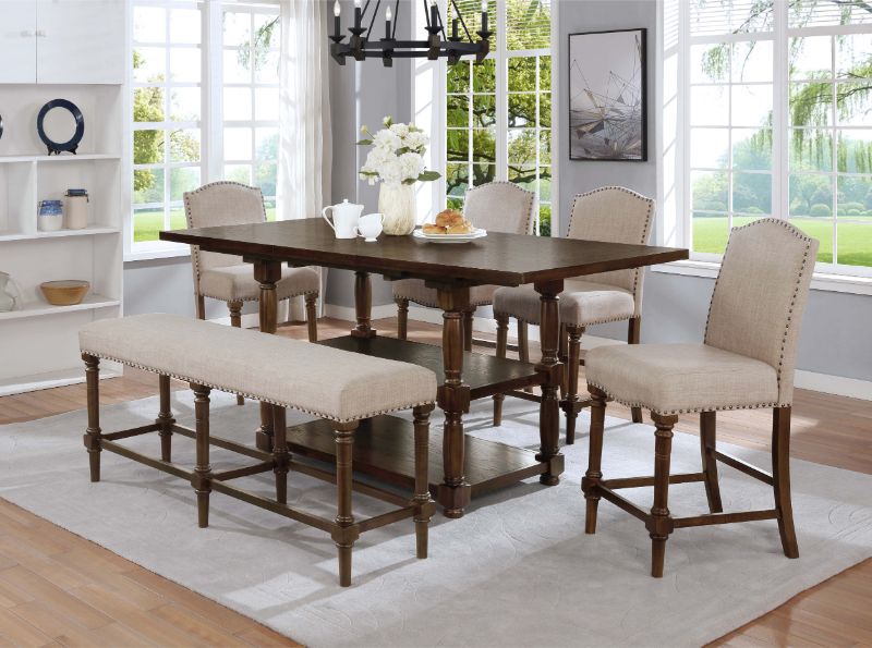 6 pc Winston porter tyler walnut finish wood counter height dining table set. This set features a counter height dining table and 4 – side chairs with bench. Table measures 36″ x 60 (78″ with 1 – 18″ butterfly leaf) x 36″ H. Upholstered chairs measure 18.3″ x 22″ x 42.5″ H. Bench measures 15.75″ x 60.8″ x 24.2″ H. Some Assembly Required.