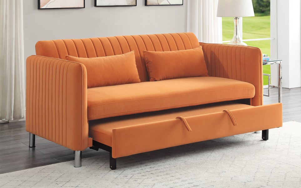 Homelegance 9406RN-3CL Winston porter Strader orange velvet fabric sofa with pop up sleep area and fold down back. Features a pull out pop up sleep area and fold down back. Measures 72″ x 34″ x 34.5″ H. When flat measures 72″ x 74″ x 29.5″ H. Some assembly required.