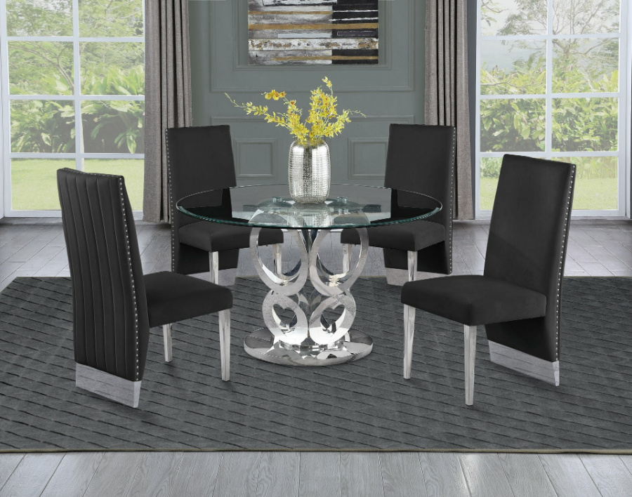 D17-4SC166 5 pc clear 48″ round glass top with stainless steel base black velvet chairs dining table set. This set includes the table with 4 – side chairs. Table measures 48″ x 30″ H. Side chairs measure 19″ x 25″ x 42″ H. Additional chairs available at additional costs. Some assembly required.