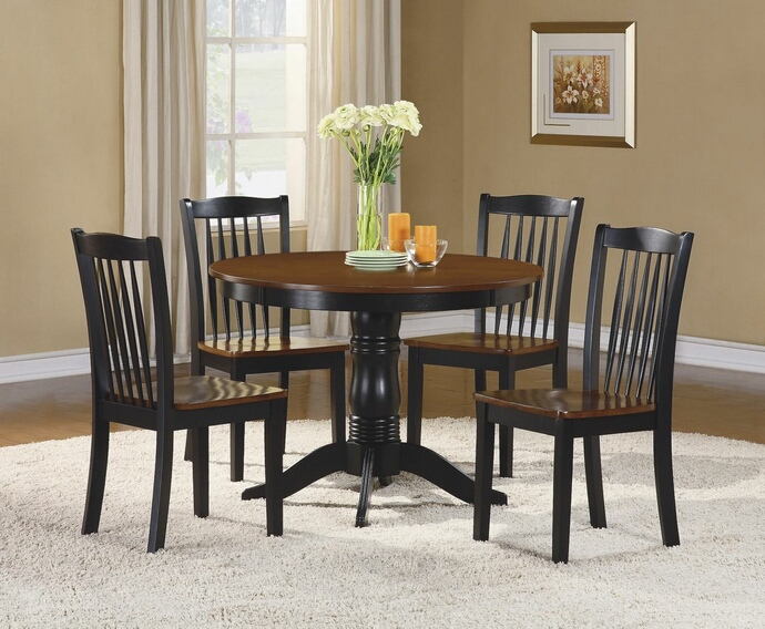 5 pc Wayland collection antique oak and black finish wood round dining table set with wood seats. This set includes the table, 4 – side chairs with wood seats. Table measures 42″ Dia. x 30″ H. Side chairs measure 18″ x 21″ x 36″ H. Some assembly required.