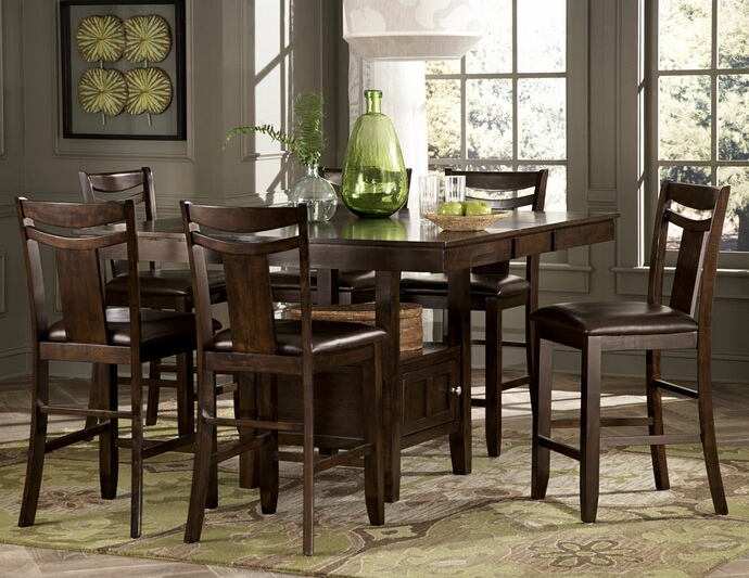 7 pc Broome collection dark brown finish wood counter height dining table set with upholstered seats. This set includes the table, 6 – side chairs with upholstered seats. Table measures 54″ x 42″ (54″ with leaf) x 36″ H. Side chairs measure 18″ x 21″ x 41″ H. Additional chairs also available separately. Some assembly required.