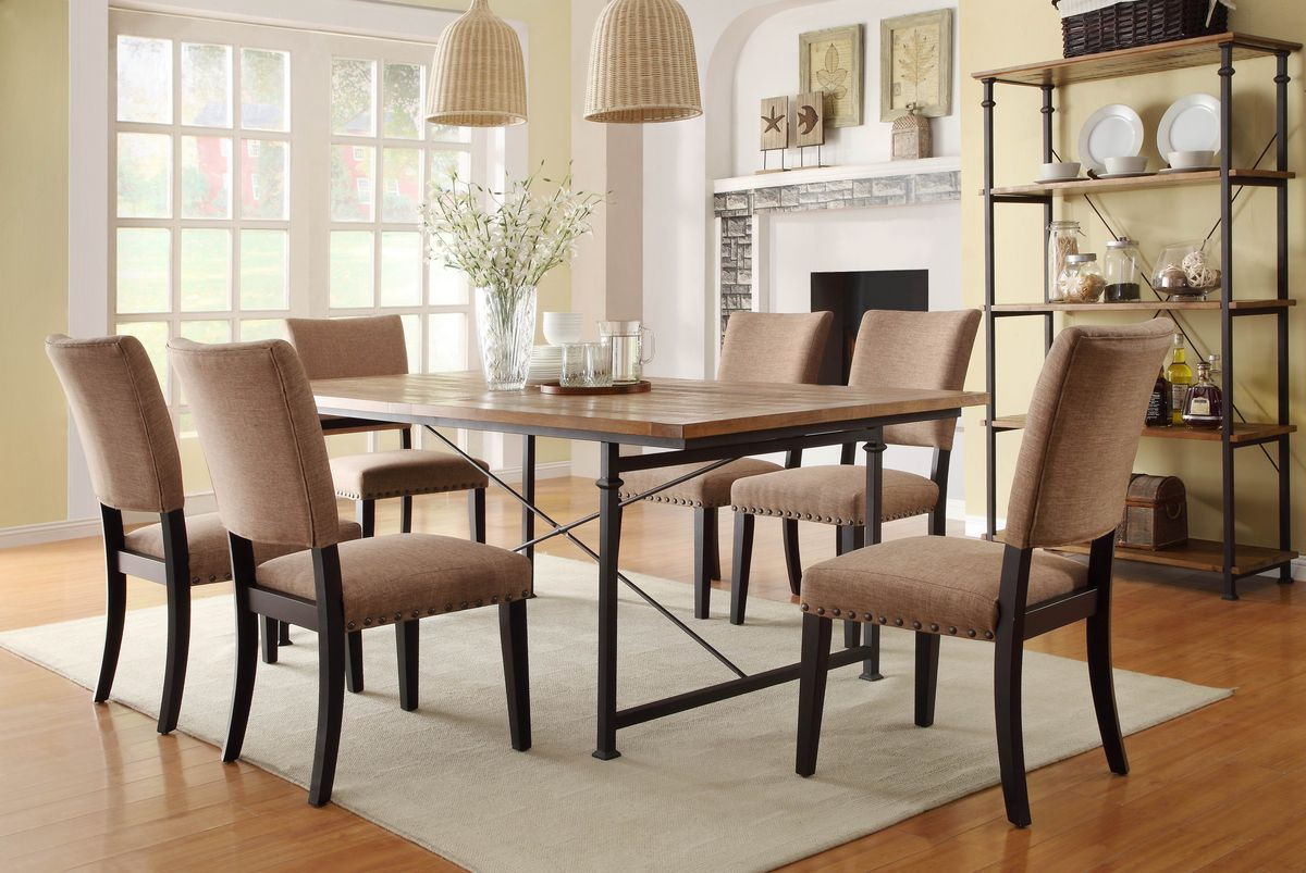 7 pc Derry collection burnished rustic oak finish wood with metal X framed base dining table set. This set includes the dining table with 6 side chairs upholstered seat cushions and padded backs with nail head trim. Table measures 40″ x 84″ x 30″ H. Side chairs measure 20″ x 25″ x 38″ H. Additional chairs and hutch and buffet also available separately. Some assembly required.