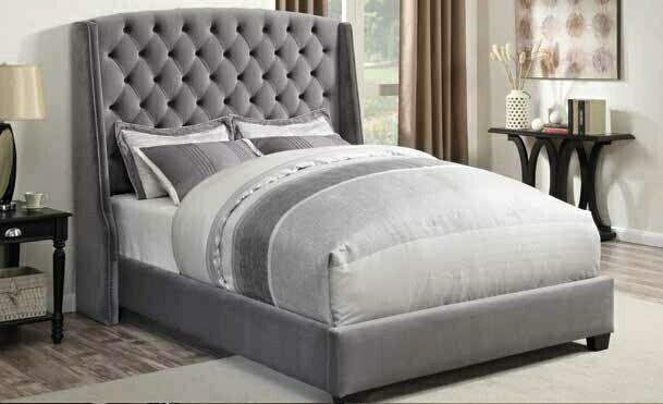 Pissarro grey velvet fabric queen bed set with tufted accents. Measures 71″ x 89″ x 63″ H. Also available in Cal king and eastern king at additional cost. Some assembly required.