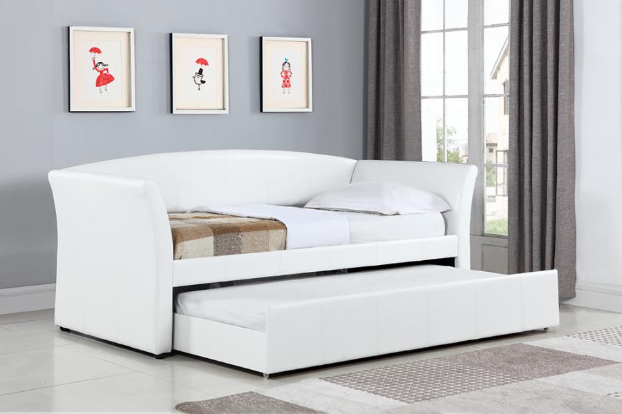 300633 Red barrel studio cristhian white leatherette daybed with trundle. Twin day bed measures 91″ L x 43″ W x 39.75″ H. Some assembly required.