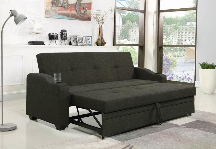 Source: 360063 Charcoal gray fabric folding sofa bed with tufted back and seat with cup holders in arms