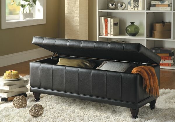 Afton collection brown bycast vinyl upholstered storage ottoman bench with tufted seat. Measures 42″ x 17″ x 19″ H. Some assembly required.