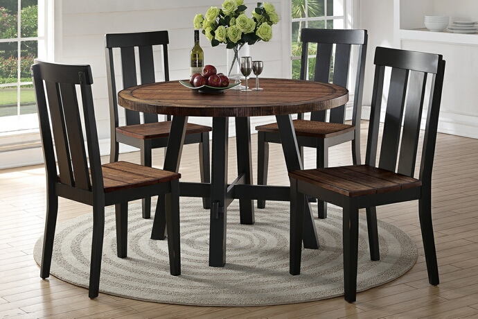 5 pc Bridget I collection two tone antiqued oak and black finish wood round dining table set. This set includes the table and 4 side chairs . Table measures 48″ round x 30″ H. Side chairs measure 22″ x 19″ x 39″ H. Some assembly required.
