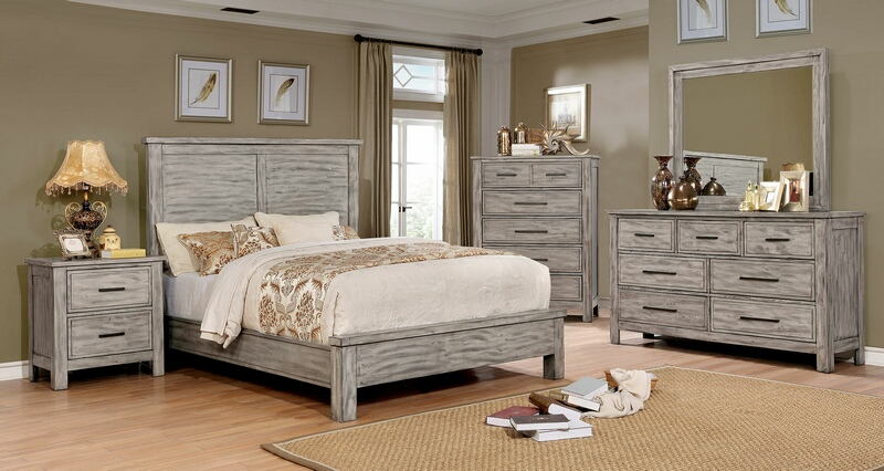 5 pc Canopus collection antique gray finish wood panel headboard queen bedroom set. This set includes the Bed, Nightstand, Dresser, Mirror, and Chest. Bed measures 88″ x 65 3/4″ x 58″ H. Nightstand measures 27″ x 18″ x 29″ H. Dresser measures 64″ x 18″ x 36″ H. Mirror measures 46″ x 1 1/2″ x 39″ H. Chest measures 38″ x 18″ x 52″ H. Also available in Cal King and Eastern King. Some assembly required.