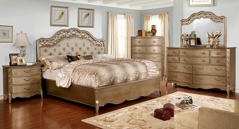 5 pc Capella collection brushed gold finish wood with upholstered tufted headboard queen bedroom set. This set includes the Bed, Nightstand, Dresser, Mirror, and Chest. Bed measures 93 1/4″ x 65 1/4″ x 63″ H. USB outlets in Nightstand measures 29 3/4″ x 18″ x 31″ H. Dresser measures 66 1/4″ x 19 1/4″ x 43″ H. Mirror measures 47 3/4″ x 1 3/4″ x 37 1/4″ H. Chest measures 39 3/4″ x 19″ x 54 3/4″ H. Also available in Cal King and Eastern King. Some assembly required.