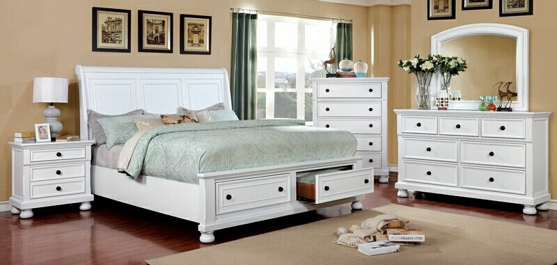 5 pc Castor collection white finish wood w/ drawers in footboard queen bedroom set. This set includes the Bed, Nightstand, Dresser, Mirror, and Chest. Bed measures 94 1/2″ x 64 3/4″ x 57 1/4″ H. Nightstand measures 28″ x 17″ x 28″ H. Dresser measures 59 7/8″ x 17 7/8″ x 37 7/8″ H. Mirror measures 42 1/8″ x 1 5/8″ x 36 3/8″ H. Chest measures 38″ x 17 7/8″ x 51 7/8″ H. Also available in Cal King and Eastern King. Some assembly required.