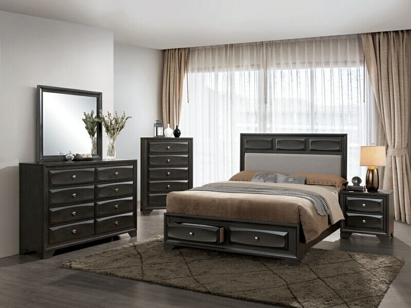 5 pc Clotilde collection antique gray finish wood w/ drawers in footboard queen bedroom set. This set includes the Bed, Nightstand, Dresser, Mirror, and Chest. Bed measures 85 5/8″ x 62 7/8″ x 53 3/8″ H. Nightstand measures 23 5/8″ x 16 1/2″ x 23 5/8″ H. Dresser measures 58 1/4″ x 16 1/2″ x 39 3/4″ H. Mirror measures 39 3/8″ x 1″ x 34 3/4″ H. Chest measures 31 1/2″ x 16 1/2″ x 47 3/4″ H. Also available in Cal King and Eastern King. Some assembly required.