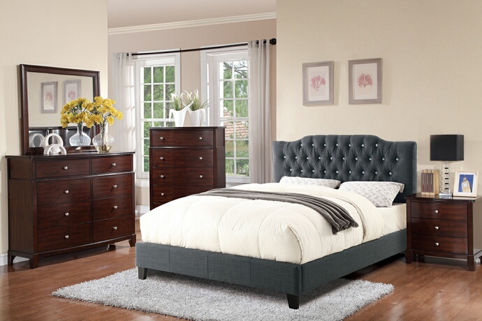 5 pc proctor collection blue grey faux linen upholstered and tufted queen bedroom set. This set includes the bed with slat kit (mattress ready), nightstand, dresser, mirror and chest. Bed measures 47″ H headboard and 13″ H footboard. Nightstand measures 26″ x 17″ x 26″ H. Dresser measures 55″ x 17″ x 43″ H. Mirror measures 40″ x 36″ H. Chest measures 38″ x 17″ x 54″ H. Some assembly required.
