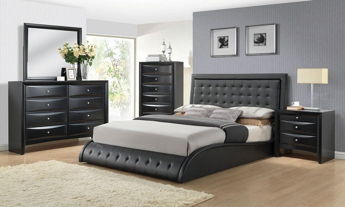 5 pc Tirrel collection modern style queen black faux leather padded bedroom set with tufted accents. This set includes the Queen bed set, one nightstand, Dresser, Mirror and Chest. Queen bed features black faux leather upholstered bed with tufted accents. Nightstand measures 26″ x 17″ x 25″ H, Dresser measures 59″ x 17″ x 41″ H. Mirror measures 39″ x 35″ H. , Chest measures 32″ x 17″ x 48″ H. Some assembly may be required. Eastern king also available at additional cost.