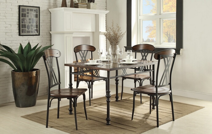 5 pc Loyalton collection oak finish wood and metal dining table set with wood seats. This set includes the table, 4 – side chairs with wood seats. Table measures 36″ x 48″ x 30″ H. Side chairs measure 20″ x 21″ x 38″ H. Some assembly required.