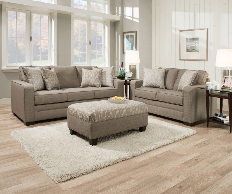 Acme 53810-11 2 pc seguin pewter fabric upholstered sofa and love seat set. This set is made in the USA by Simmons. This set includes the sofa and love seat. Sofa measures 83″ x 37″ D x 37″ H. Love seat measures 60″ x 37″ x 37″ H. Ottoman also available at additional cost and measures 33″ x 24″ x 19″ H Some assembly required.